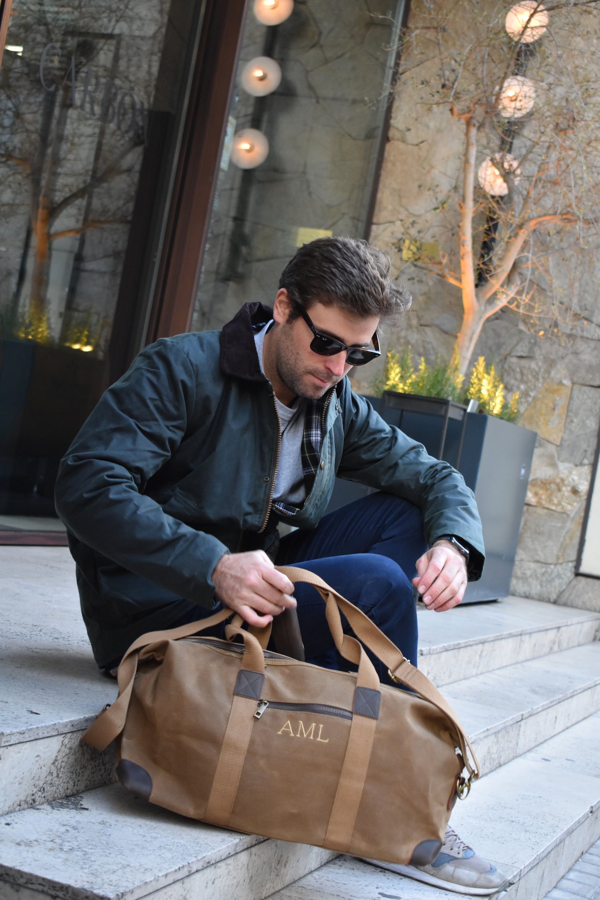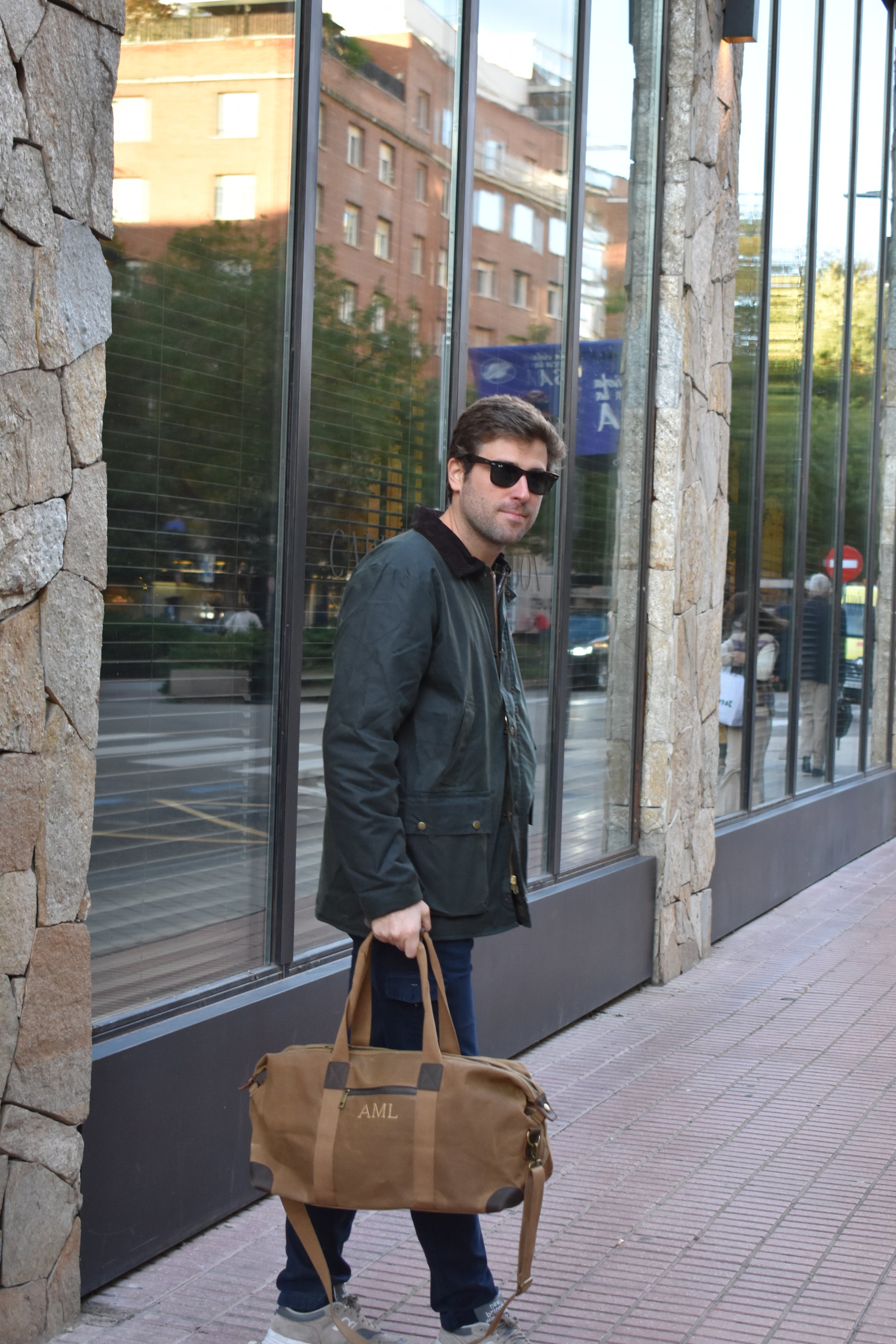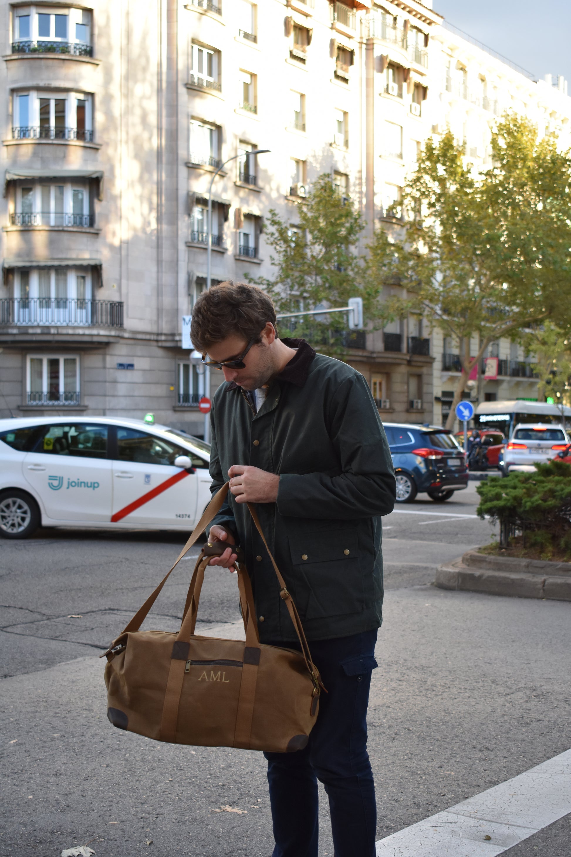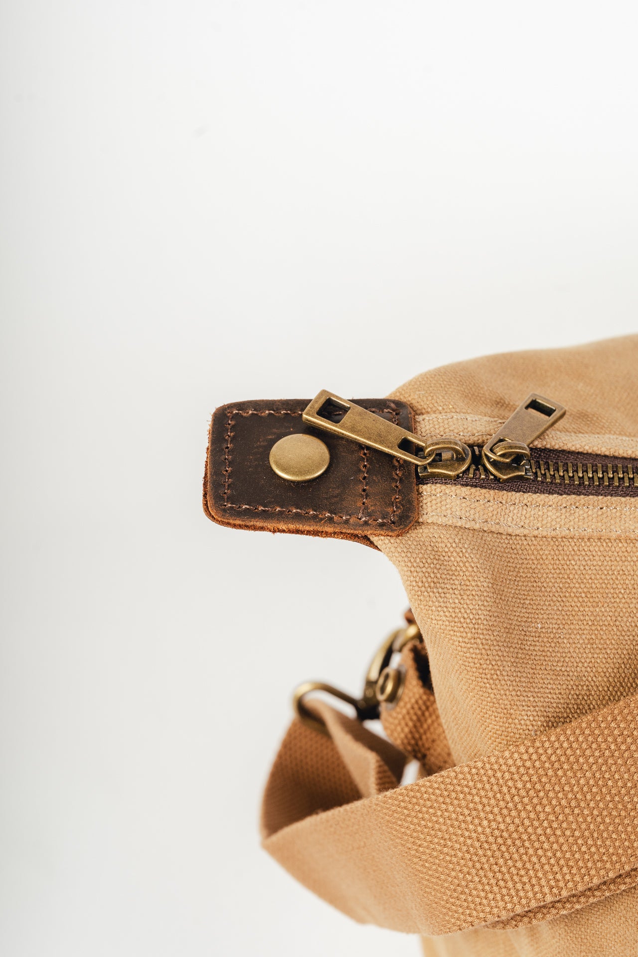 100% algodón (lona encerada) con detalles en cuero genuino y acabados en latón antiguo.
