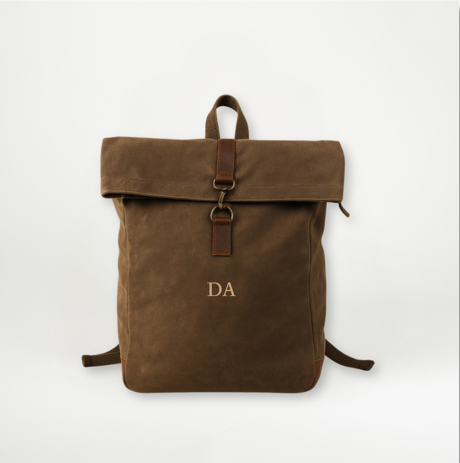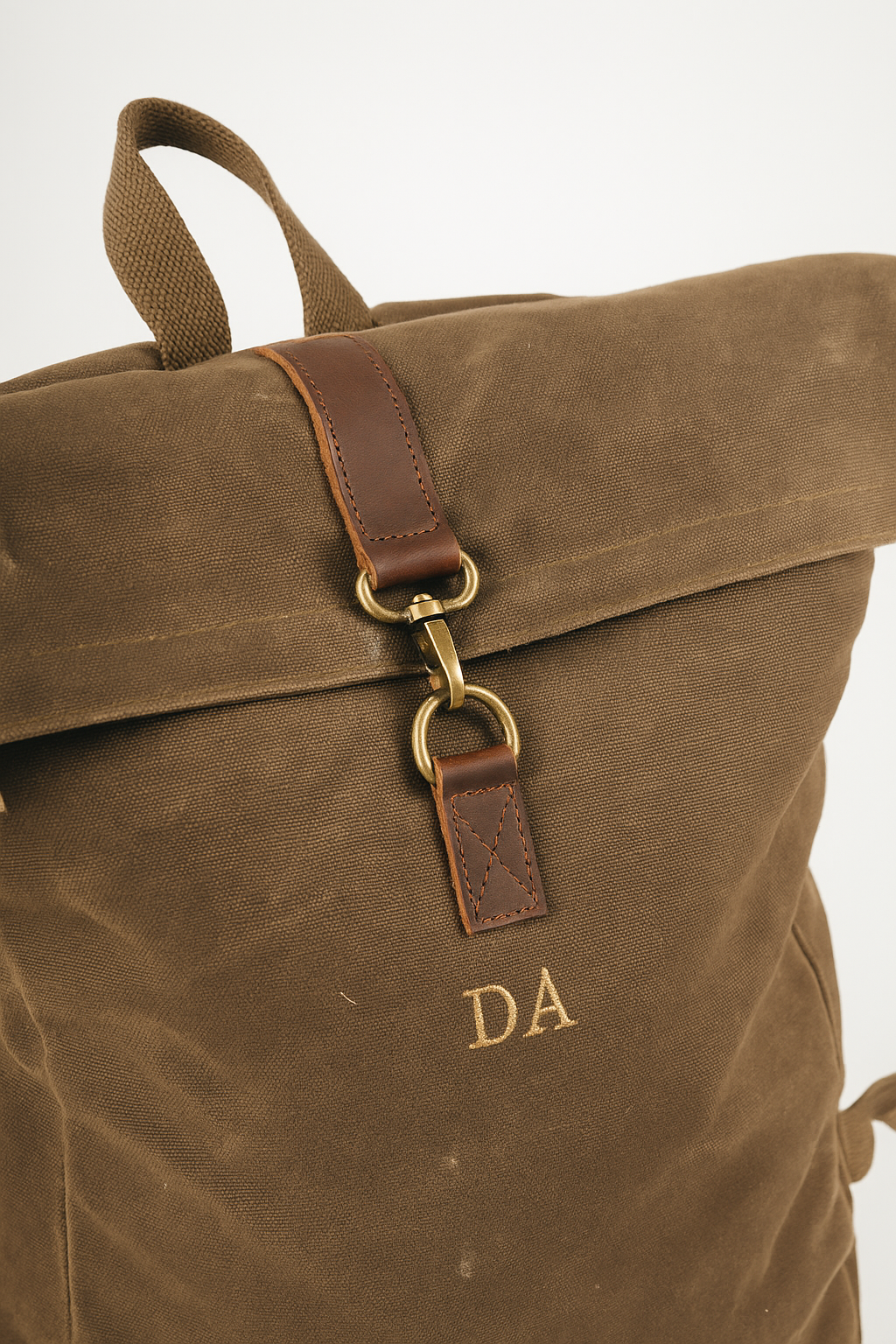 100% algodón (lona encerada) con detalles en cuero genuino y acabados en latón antiguo.