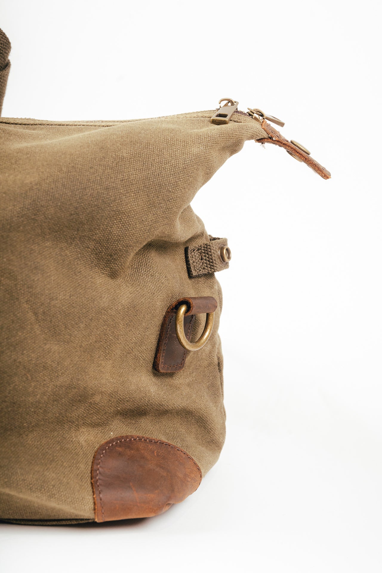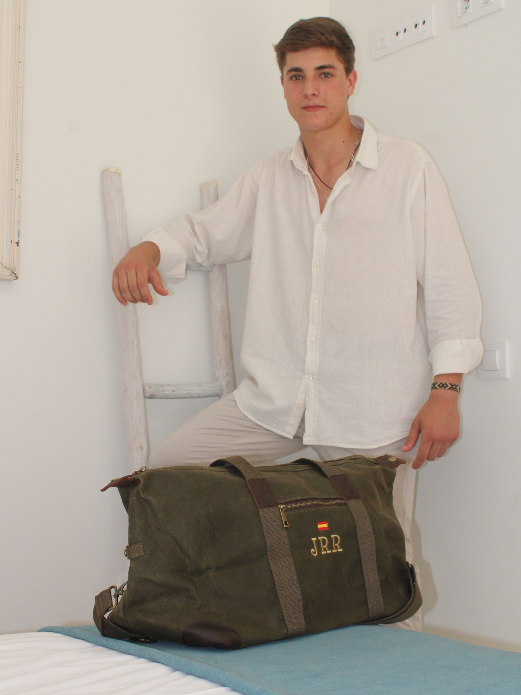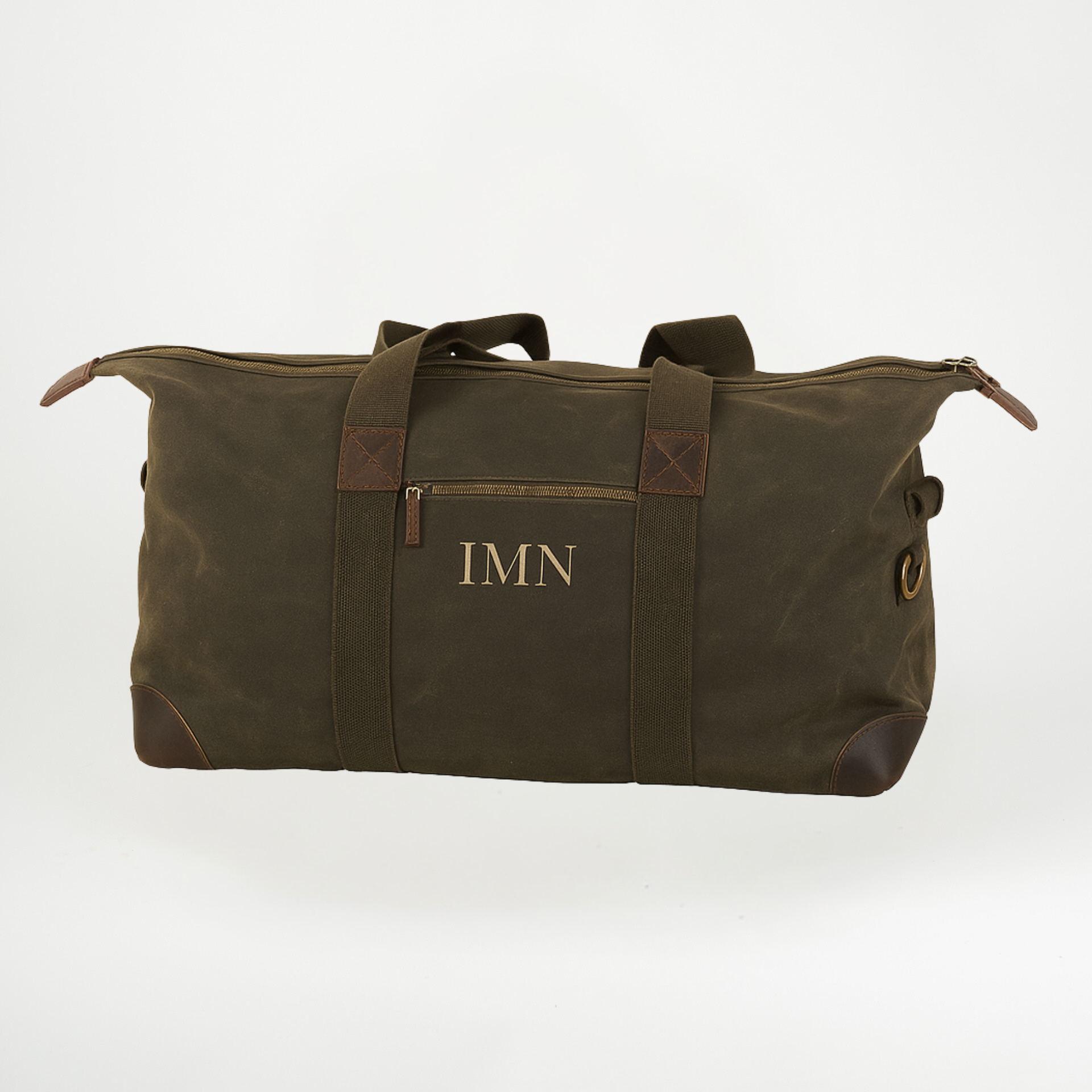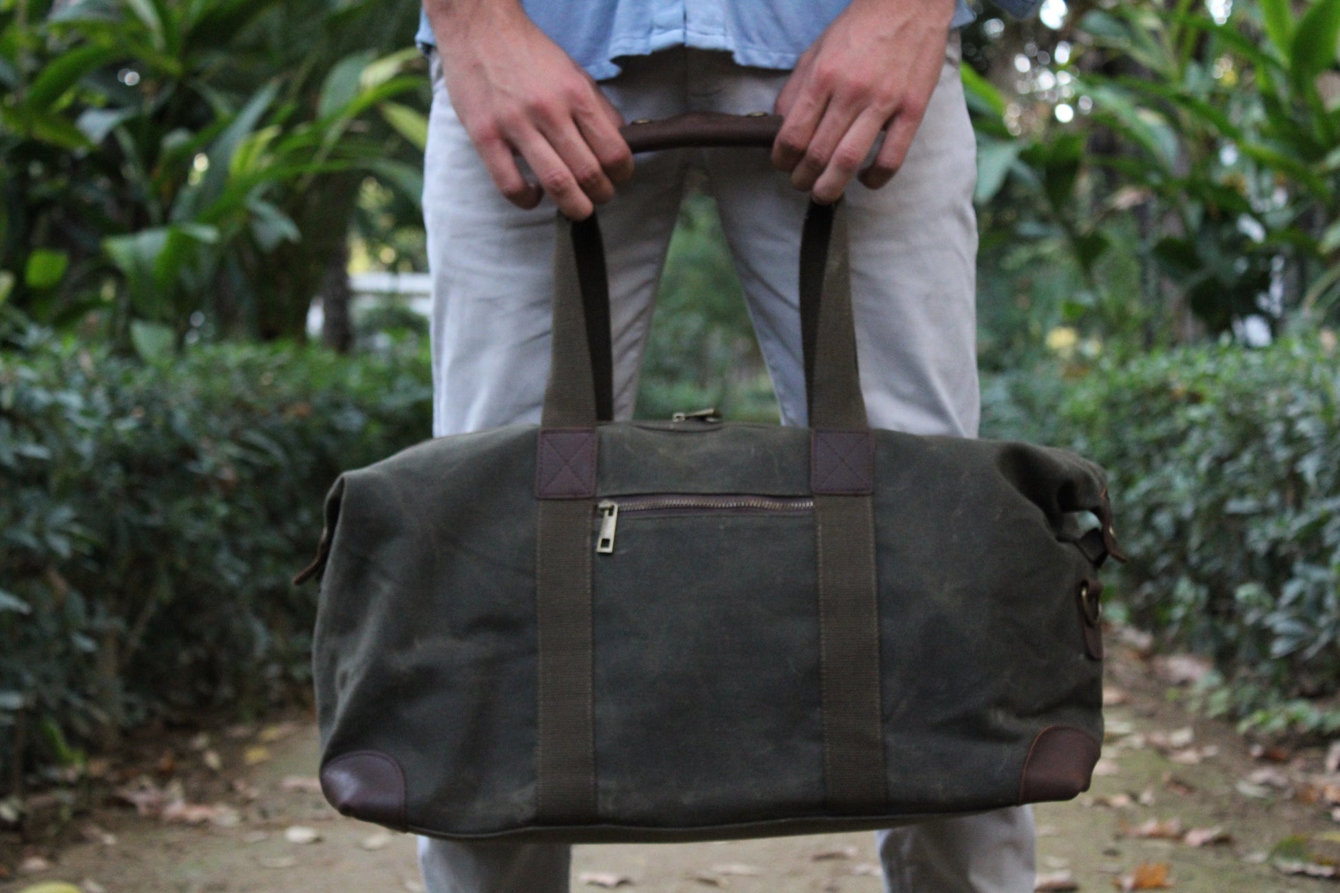 100% algodón (lona encerada) con detalles en cuero genuino y acabados en latón antiguo.