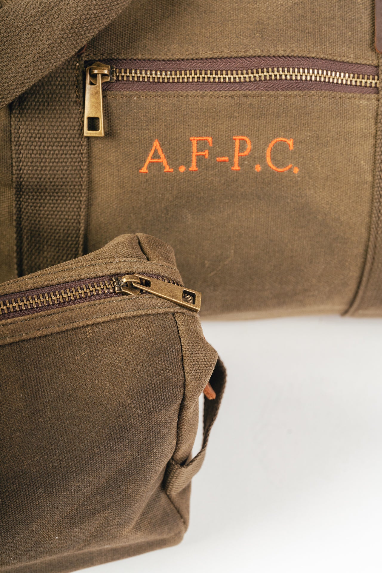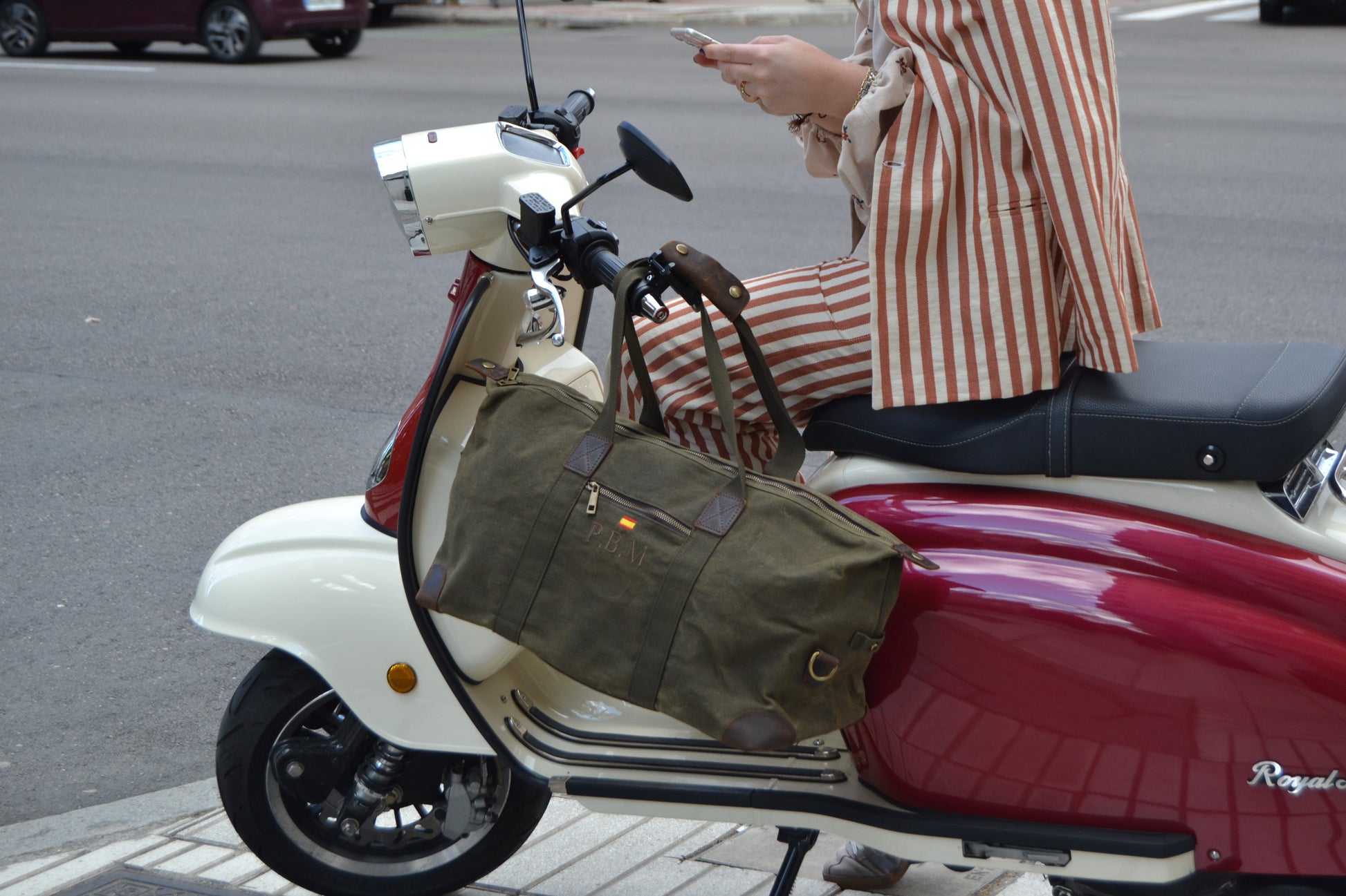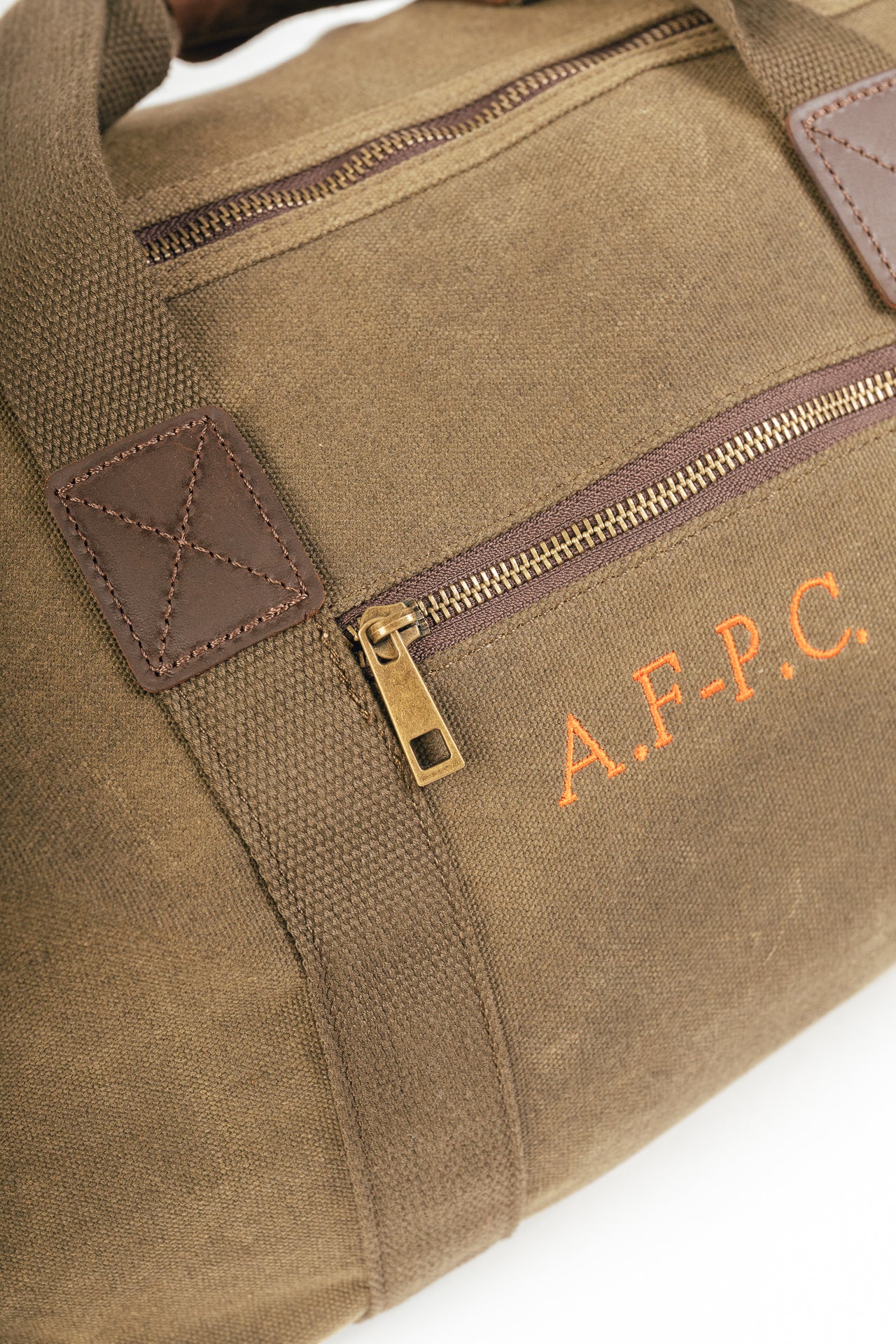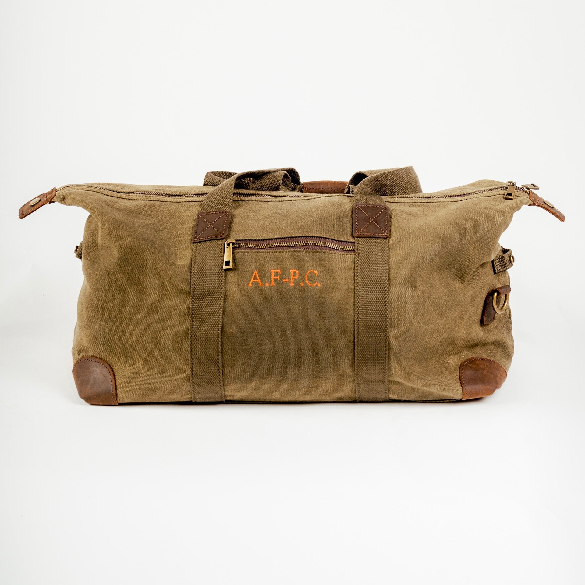100% algodón (lona encerada) con detalles en cuero genuino y acabados en latón antiguo.